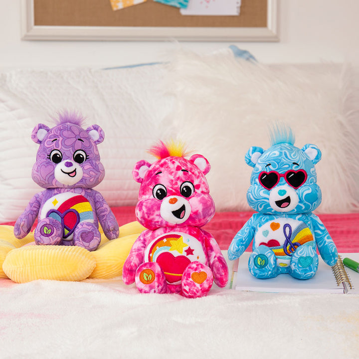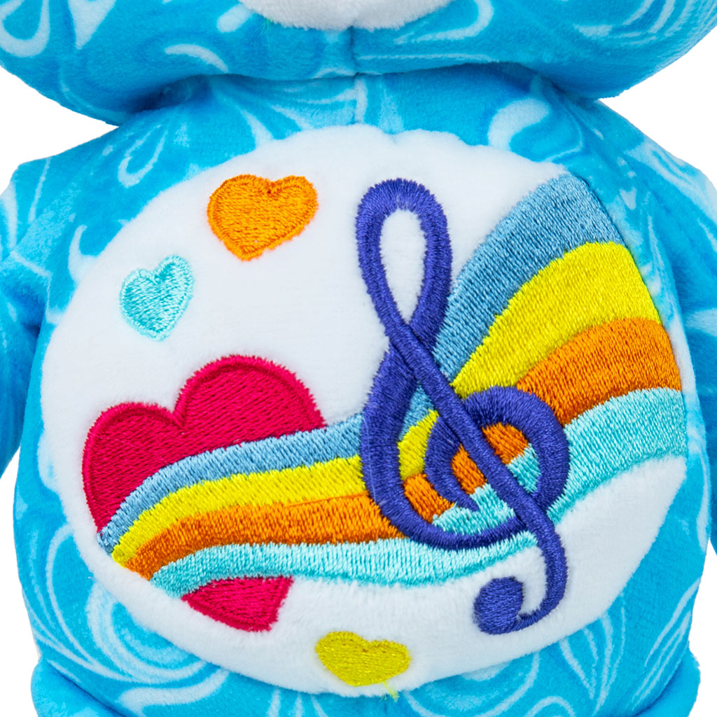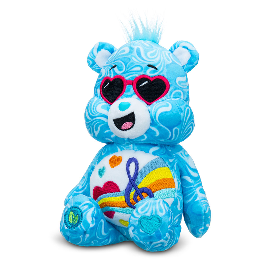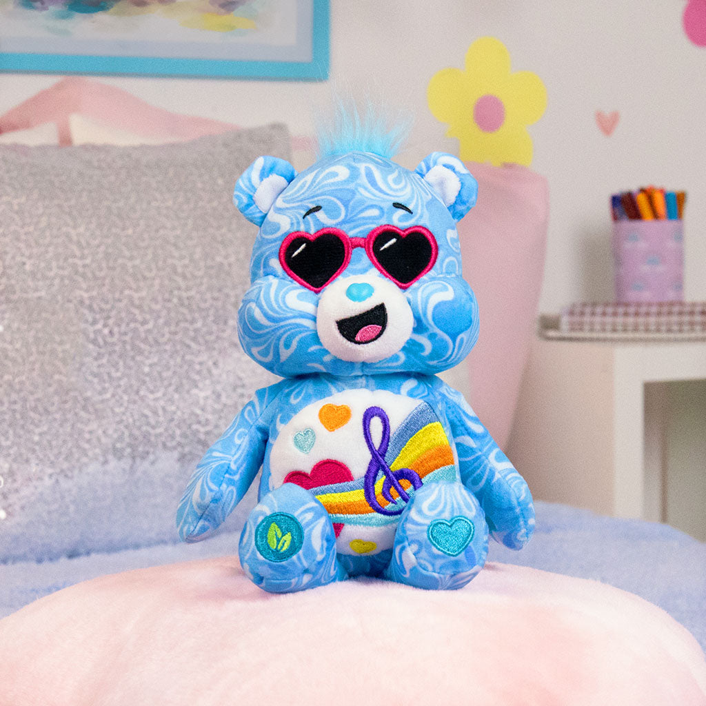 That's right, check out the newest Care Bear, 22cm Love Song Bear plushie in his brand-new stylized design of a swirly pattern all over his fur and groovy sunglasses. With unique design cues throughout and vibrant colours, he’s perfectly on trend. In addition to his stylish look, 22cm Love Song Bear in his stylish design is also made from recycled materials - designed with the earth in mind!
